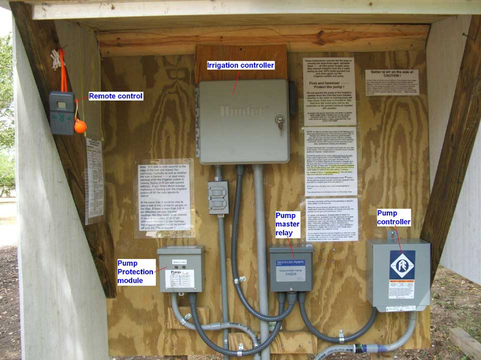 Pumps are commonly controlled electrically by using the irrigation controller, or by using a pressure switch in combination with an air tank. We generally recommend using the irrigation controller as the priority method of control. If the buyer needs requires a 24 hour on demand pressure system for lake / river water hoses or domestic home water, or, if the source of water is a water well with tank and pressure switch which also feeds the domestic water to the house - - - we have developed a proprietary win-win method of having the best features of both control methods. We know of no other irrigator or pump contractor who offers this "dual control" with the ability to have the irrigation controller have a priority over the pressure switch.